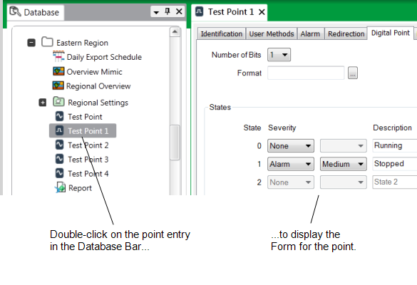 If your User Account does not have the Double Click Shows Properties feature enabled, double-clicking will display the Status display, rather than the Form for the item. In this case, you will need to use a context-sensitive menu to display the Form. For information on other ways to display a Form and on how to display the Database Bar, see Display a Form in the Geo SCADA Expert Guide to Core Configuration.