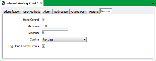 To set the value of an Internal point, you ‘hand control’ the point value. Specify the hand control properties using the fields on the Manual tab of the Internal Analog Point Form.