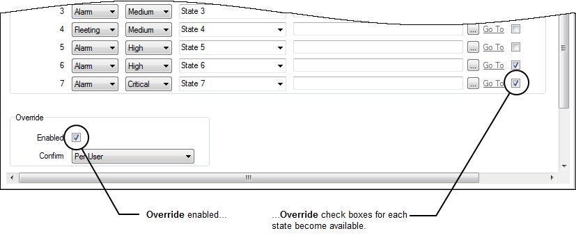 5. Use the Confirm combo box to define whether a confirmation dialog box is displayed whenever an operator requests that a point is overridden (see Requesting Confirmation of Action Requests in the Geo SCADA Expert Guide to Core Configuration).