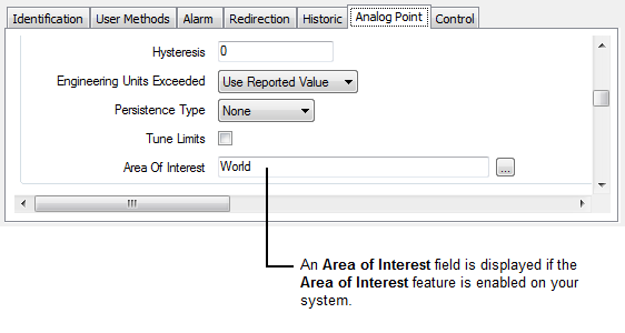 If the Area of Interest feature is enabled on your system, an additional Area of Interest field is displayed within the Alarm Limits section on the Analog Point tab.