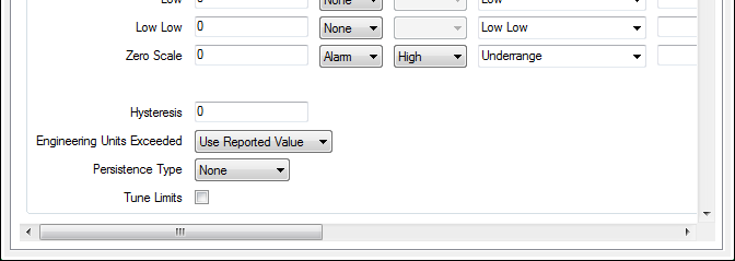 The Hysteresis feature allows you to define the amount by which an analog point’s value has to decrease below a high limit, or increase above a low limit, for an alarm to be cleared. This helps to ensure that an analog point’s alarms are not continuously raised then cleared if its value fluctuates around an alarm limit.