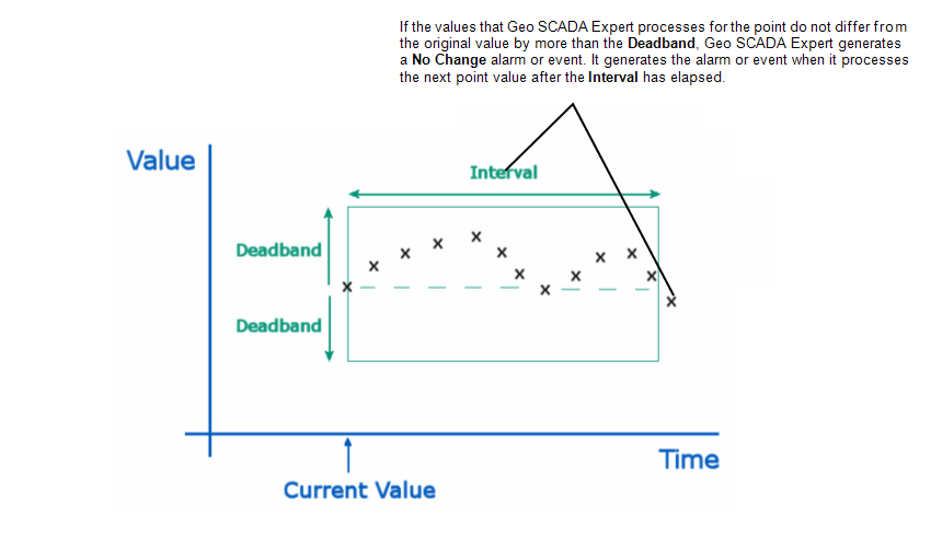 The No Change feature works by checking whether a value has changed by more than a specified Deadband, within a specified time Interval.