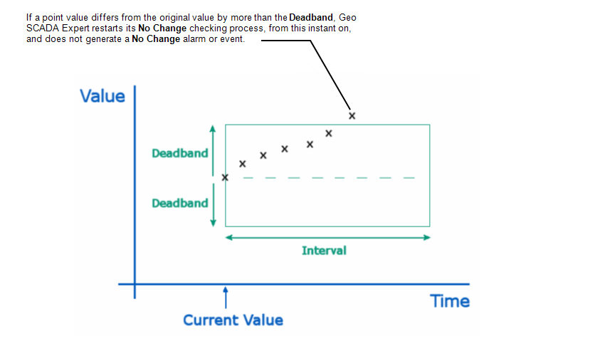 If the value changes sufficiently within the Interval, Geo SCADA Expert restarts its No Change checking process, from the instance at which it deems the point’s value to have changed sufficiently: