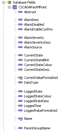 To add fields to the report, the Database Fields entry is expanded in the Field Explorer Bar, so that it shows the fields that are available in the CSCADAPackMPoint table.