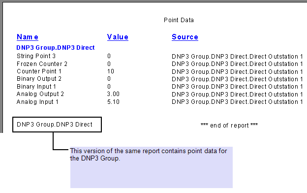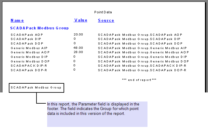 To enable Group selection in this way, the Parameter field that was added to the report references the ParentGroupName field within the CDBPoint table. The ParentGroupName field is the field that specifies the Group to which each point belongs.
