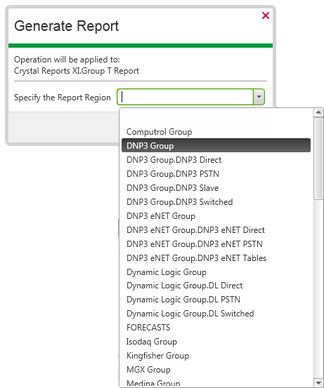 The user uses the combo box to display a list of available Groups and specify the Group for which the report is to be generated: