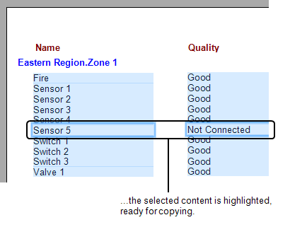 You can copy content from the Crystal Reports Viewer and paste that content to another application. For instance, you might want to copy a particular field or row of data into a document, or paste the content into the Notes that are associated with that report in Geo SCADA Expert