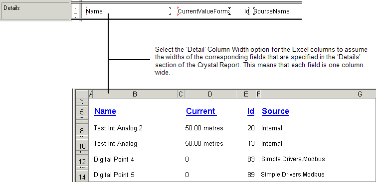 - Column Width Based on Objects in Area—Use this combo box to specify the criteria that you want Geo SCADA Expert to use for assigning the column widths in the Excel version of a report. As Header and Footer ‘field objects’ are optional in Crystal Reports, you should only select an option that is applicable to that particular report.
