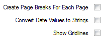 - Create Page Breaks For Each Page—Select this check box if page breaks are to be included in the exported report. You can view the page breaks by using the ‘Page Break Preview’ option within Excel.