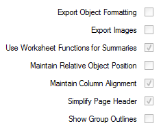 - Export Object Formatting—Select this check box to export the object formatting for a report. Clear the check box to set the exported report to use the default Excel formatting.