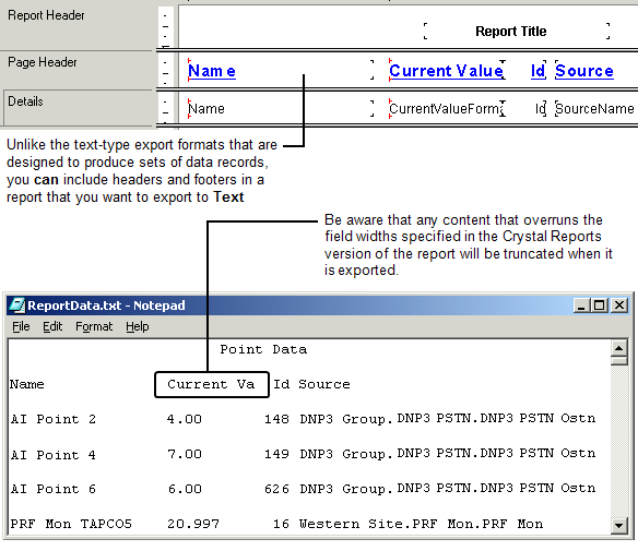 Be aware that the export process takes into account the report’s field widths when exporting data and truncates any content that overruns such widths.
