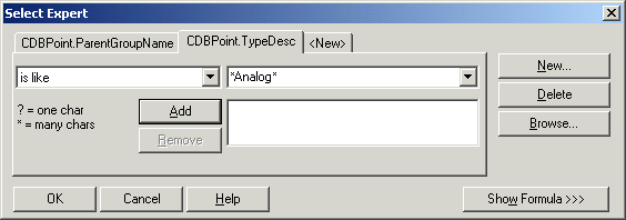 The Select Expert window is used to select the TypeDesc field and specify that the field has to contain the string ‘Analog’ for a point to be included in the report.