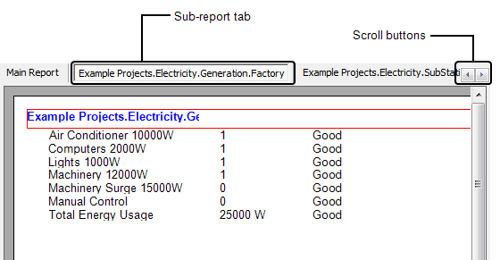 If you have multiple sub-reports open you can use the Scroll buttons to move between sub-reports. The Main Report tab is always displayed on left of the viewer panel.