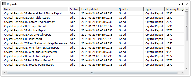 The Reports List is Crystal Reports specific—it is only available on systems that have the Crystal Reports driver installed. You use the Reports List to display a list of the Reports on your system. You can display the List from the Queries Bar or the web interface, as you would any other Lists (see the Geo SCADA Expert Guide to Lists).