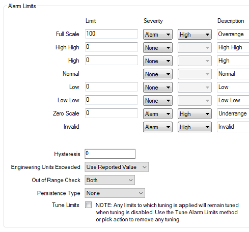 - Hysteresis—Use to Specify the Hysteresis - the Minimum Value Change that can Clear an Alarm.