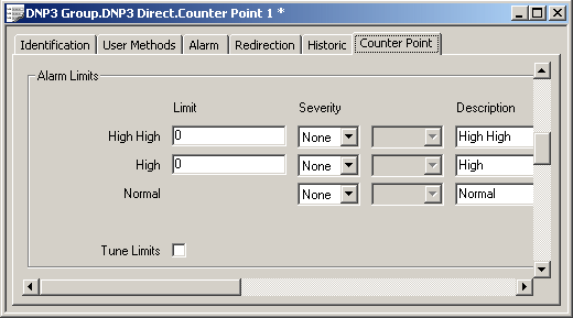 Use the fields within the Alarm Limits section of the Counter Point or Frozen Counter tab to set the limit values for the point and specify whether an alarm or event is generated if the value of the counter rises to, or exceeds, a limit.