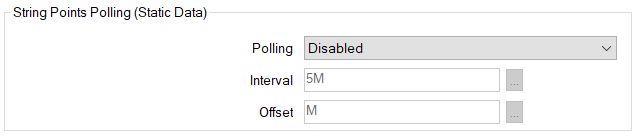 Use the fields within the String Points Polling section of the DNP3 tab to specify whether Geo SCADA Expert is to scan an outstation for static String point data: