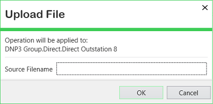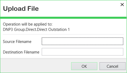 Where an outstation supports the Legacy g70v1 File Transfer variation, the Upload File window includes a single Filename field. Use the field to enter the name of the file that you want to upload, and then select the OK button to perform the upload.