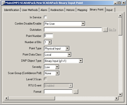 Use the fields at the top of the Binary Point tab to define the general properties of a DNP3 SCADAPack binary point. For further information on most of these properties, see Configure Common Properties of DNP3 SCADAPack Points in this guide, and see Configure General Properties in the Geo SCADA Expert Guide to the DNP3 Driver. Properties that are specific to DNP3 SCADAPack Binary points are explained below: