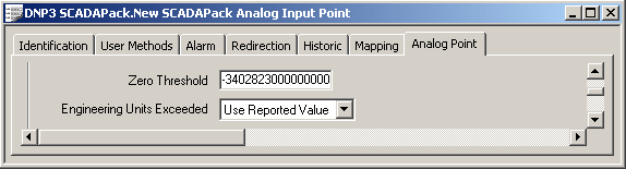 - Zero Threshold—Use to specify the engineering value below which the DNP3 SCADAPack analog point’s value will be forced to zero.