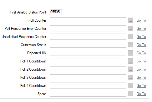 If the remote outstation is in an Instance of a Group Template, enable the appropriate Property Overrides to allow the First Analog Status Point to be specified on a per-Instance basis.