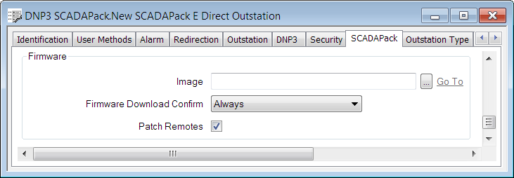 Use the fields within the Firmware section of the SCADAPack tab to define the properties associated with downloading operating system firmware to the outstation. In order to configure these Firmware properties successfully, a suitable DNP3 SCADAPack Firmware Image item has to exist in the Geo SCADA Expert database (see Configure a DNP3 SCADAPack Firmware Image Item).