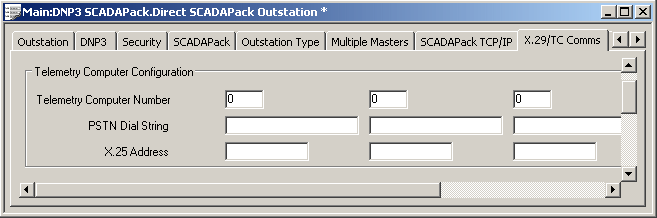 Use the fields within the Telemetry Computer Configuration section of the X.29/TC Comms table to specify the connection properties of up to four DNP3 master station servers that are running the X.29 Packet Assembler/Disassembler (PAD) software. The servers are also known as Telemetry Computers (TCs).