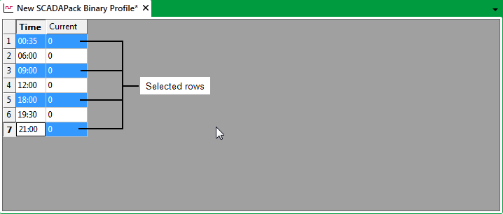 When you first add a DNP3 SCADAPack Profile to your database, that Profile will have no rows. Use the procedures below to add single or multiple rows of vectors to your Profiles. Each Profile needs to include one row per change in profile value. The maximum rate at which a profile can change value is at one-minute intervals.