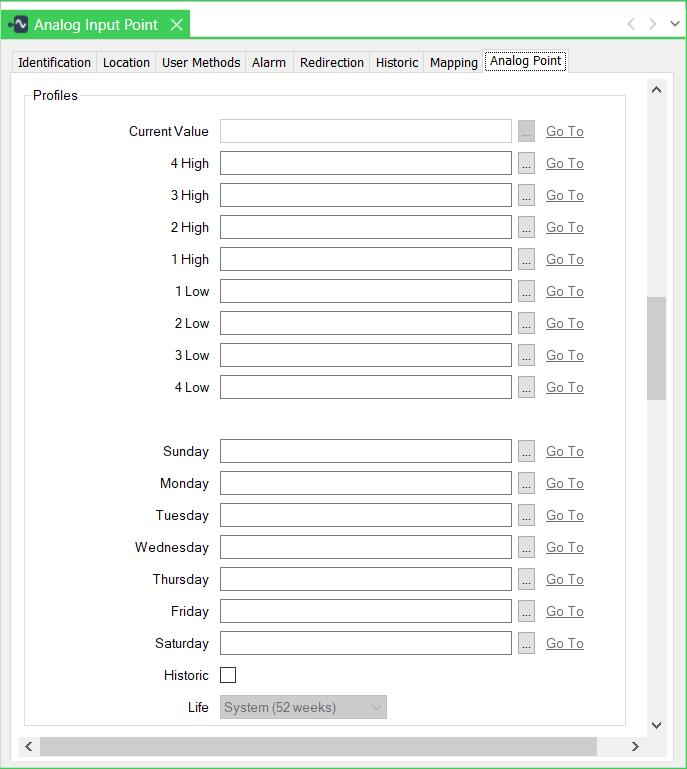 Use the Life combo box to select the duration to keep the profile values online for the point (see Specify the Per Point Historic Lifetime).