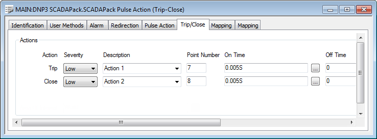 Use the fields within the Action section of the Trip/Close tab to define the configuration of the Trip and Close pulse actions.