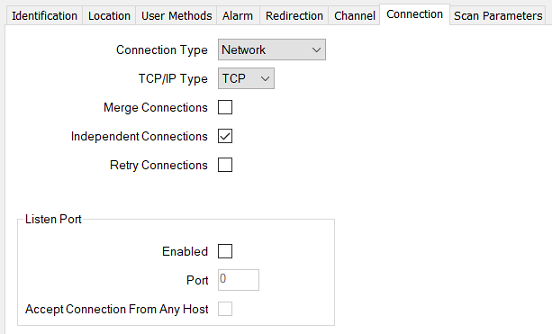 For a channel to represent a Network connection, set the channel’s Connection Type field (if displayed) to ‘Network’. (The Connection Type field is only displayed for channels that support a choice of connection types — see Configure a Channel’s Connection Type.)