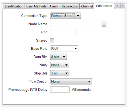 Configure the required connection properties using the fields that are displayed on the rest of the tab. Channels that represent Remote Serial connections have a combination of these fields: