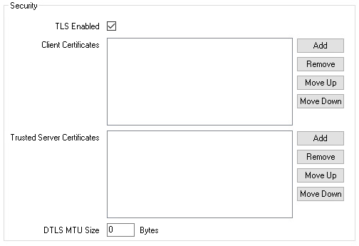 DTLS MTU Size—This field is enabled only when the TCP/IP Type is set to UDP (see Configure a Channel’s TCP/IP Connection Properties). Use this field to set the maximum transmission unit (MTU) size (in bytes) of a data packet. The valid range is from 200 to 65,535 bytes.
