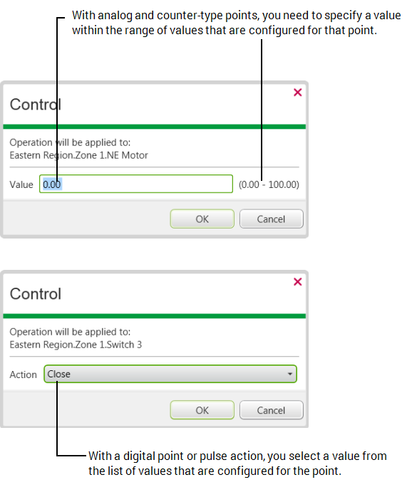 Specify the required value in the Value field. Depending on the type of point, you may be offered a combo list of point values, or need to specify a value within a particular range. The range or values from which you can choose are determined by the point’s configuration.