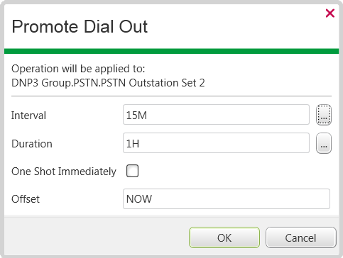The Promote Dial Out pick action is triggered on a particular outstation. The action that is requested uses the settings that are displayed in the window shown above. This results in Geo SCADA Expert sending a One Shot call 15 minutes after the promotion was requested, followed by further One Shot calls at 15-minute intervals, until the one-hour duration has elapsed. As such, the action results in a total of four One shot calls being sent to the outstation.