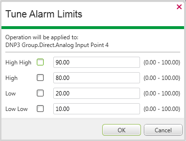Use the Tune Alarm Limits action to temporarily alter a point’s alarm limits during exceptional circumstances. For instance, in bad weather conditions when a flood situation is known to exist, you might want to tune a point’s limits to stop unnecessary alarms from being raised.