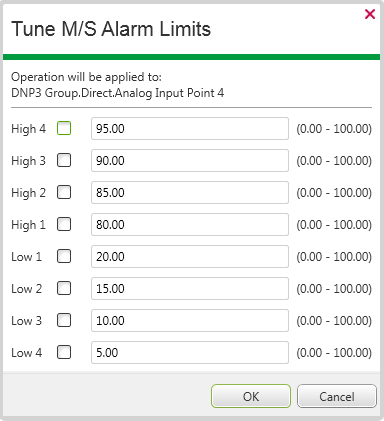 When you select the Tune M/S Alarm Limits pick action, the Tune M/S Alarm Limits window is displayed. The number and description of the fields that are displayed in the window varies, depending on the point’s configuration (the number of ‘master station’ alarm limits is configurable on a per-point basis).