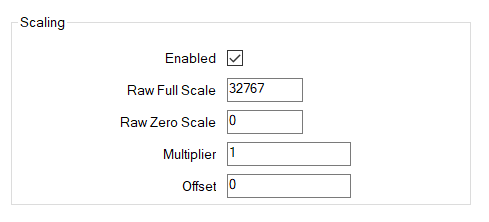 • Enabled—Select this check box if the input value at the controller needs scaling for use by Geo SCADA Expert, and vice versa for output values. The EtherNet/IP driver performs the required scaling before passing the value on to Geo SCADA Expert. Use the Raw Full Scale and Raw Zero Scale fields to define the scaling that is required, up to a maximum 32-bit value.