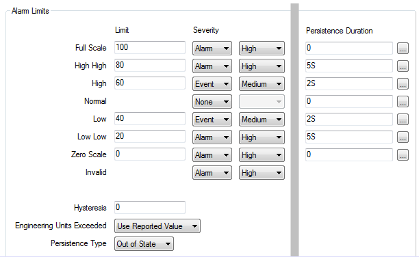 If during the two-second period, the point’s value did not rise, but instead it continued to fall, if it dropped below 20 (the Low Low limit), the persistence timer would restart. A period of 5 seconds would then have to elapse before the point value and state (Low Low) were deemed to have changed and are recorded. This is because the Persistence Duration for the point going into the Low Low state is specified as 5S (5 seconds).