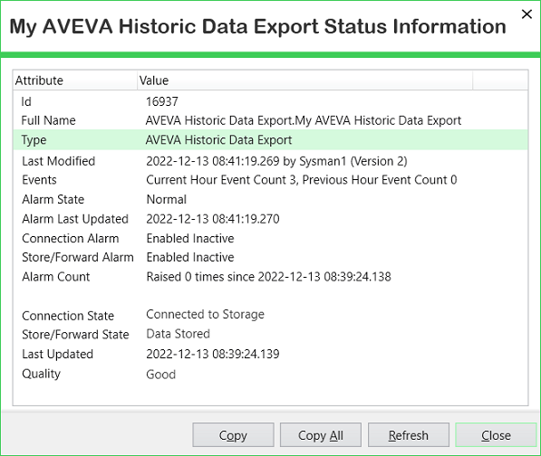 - The status of the network connection between Geo SCADA Expert and the historian on the AVEVA application to which historic data is being exported
