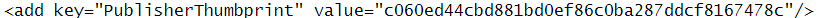 - Paste the Thumbprint value into the PublisherThumbprint attribute in the AVEVA Insight Publisher file. The file has the name aahCloudConfigurator.exe.config. By default, the file is stored at the following location: