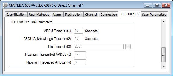 - Maximum Received APDUs (w)—Specify the maximum number of APDUs that Geo SCADA Expert can receive on this channel, before it sends confirmation that it has received those APDUs successfully.