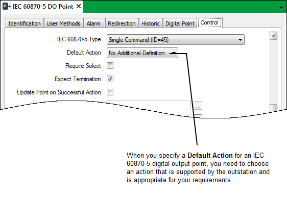 You can define a Default Action for IEC 60870-5 Digital Output Points. The action you choose will be performed whenever Geo SCADA Expert sends a control request for the relevant point on the outstation. To find out which default actions are supported, please refer to the outstation’s interoperability Profile document.