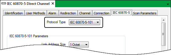 Use the Protocol Type combo box at the top of the IEC 60870-5 tab to specify which communications protocol is used by the channel: