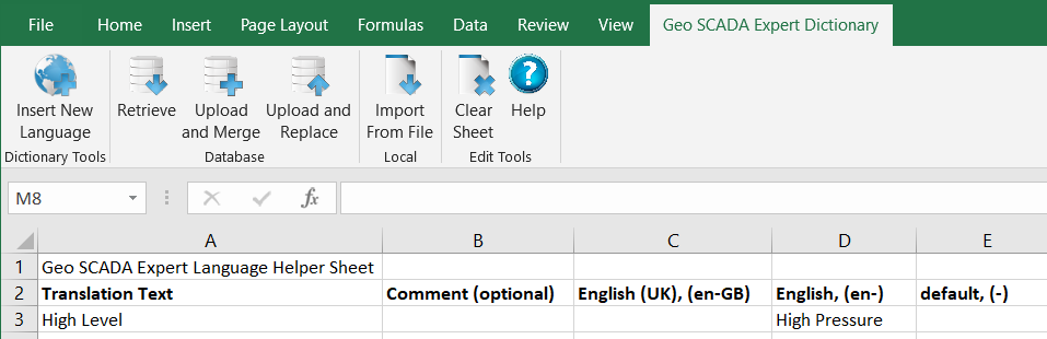 The In-Database Translation Dictionary is part of the Geo SCADA Expert database and, for convenience, you can create and maintain it in a Microsoft® Excel® spreadsheet by using an Excel add-in program. For more information, see Introduction to the In-Database Translation Dictionary.