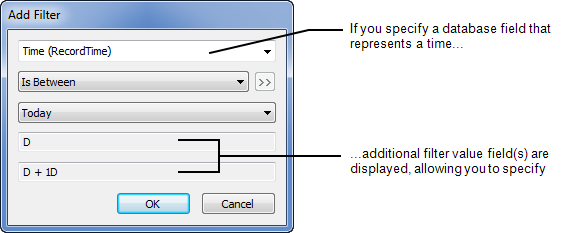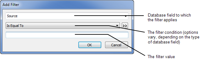 (To specify more than one value in this field, select the >> button next to the second combo box. This is only available for certain combinations of database field type and filter condition. When selected, the Add Filter window expands, enabling you to specify a series of filter values in the third field (see Specify a Series of Filter Values).)