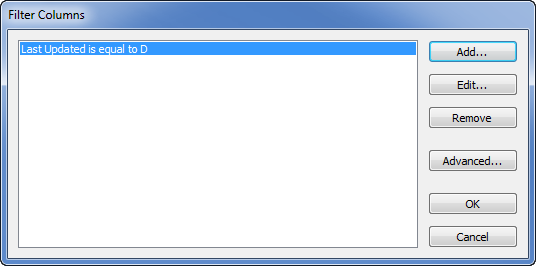 (Multiple filters are combined using the logical AND operator. To combine multiple filters using the logical OR operator, select the Advanced button on the Filter Columns window and directly edit the SQL WHERE clause. For more information, see Use SQL to Create a Filter for a List other than an Alarms List.)