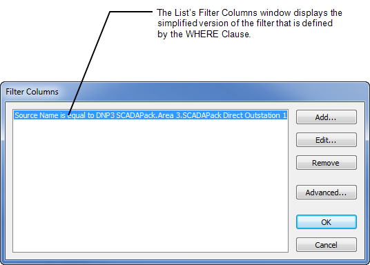 (You can select the Advanced button on the Filter Columns window to show the actual WHERE Clause, and edit that clause if required (see Use SQL to Create a Filter for a List other than an Alarms List).)