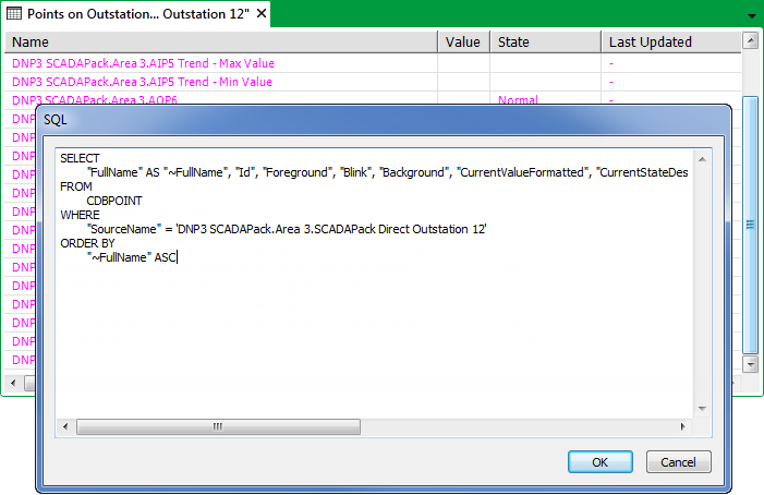 The SQL window shows that the SQL query returns a series of fields (listed below the SELECT clause) from the Geo SCADA Expert Point Table CDBPoint. The SQL retrieves only those records that pertain to the database item ‘Direct Outstation 1’ within the ‘DNP3 Direct’ Group, which is itself in the ‘DNP3 Group’ (as defined by the WHERE clause). Finally, the returned data is displayed in ascending order (ASC), by full name.