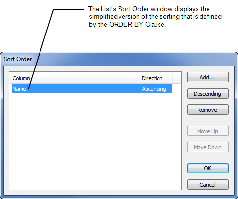 The ORDER BY Clause is the SQL that is used to determine the List’s sort order—this can also be determined by right-clicking on the List and selecting the Sort option to display the Sort Order window:
